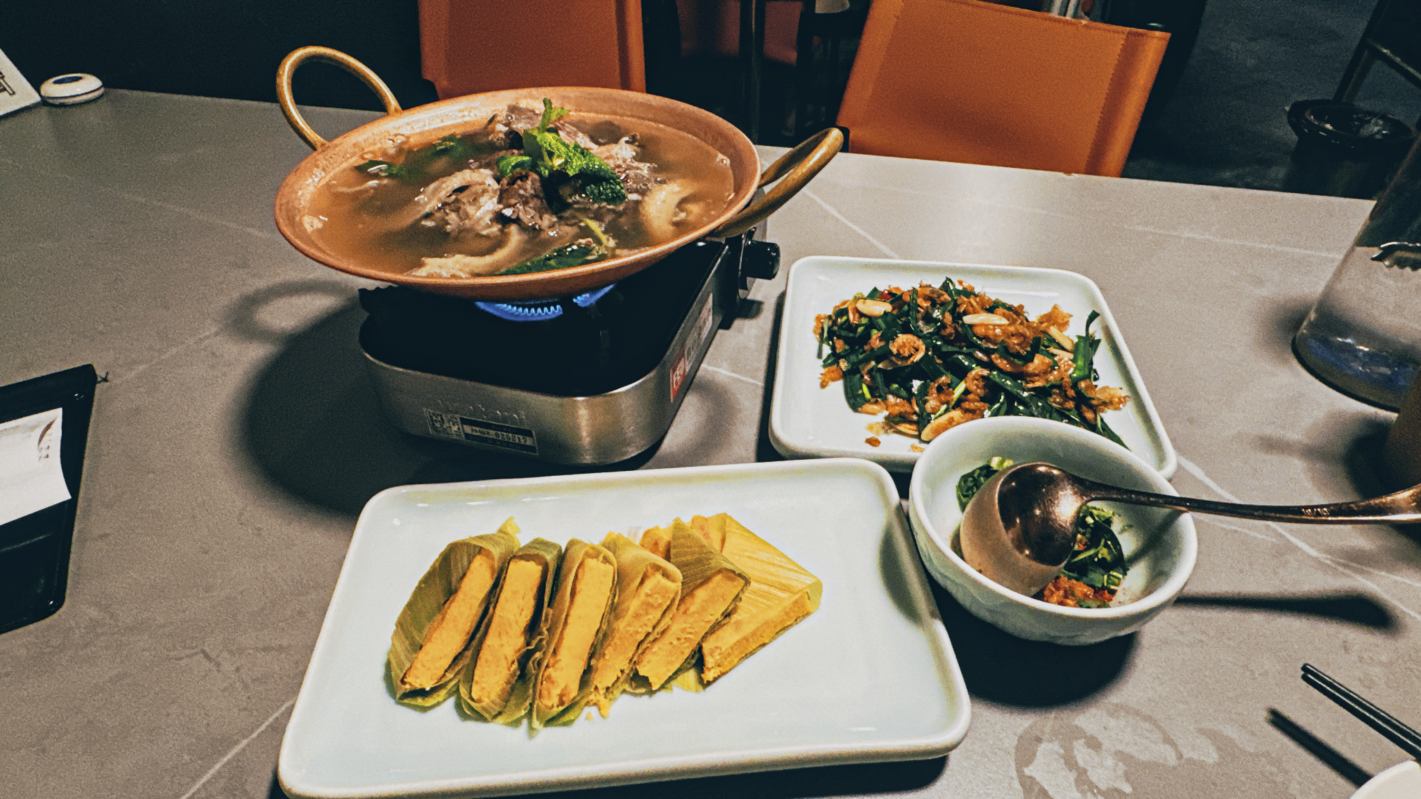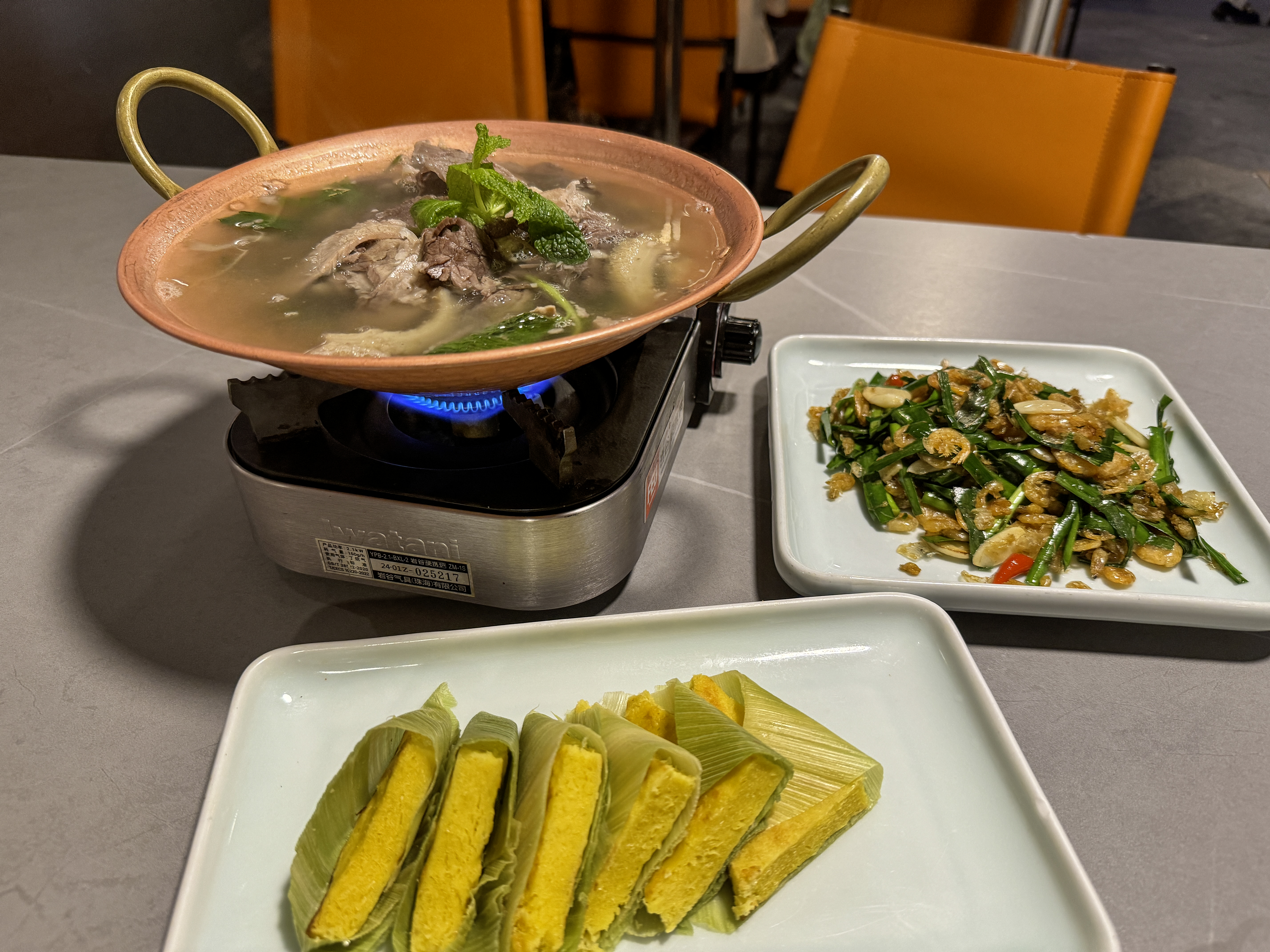 윈난식 소고기 훠궈, 새우부추볶음, 옥수수가루떡을 주문했다.