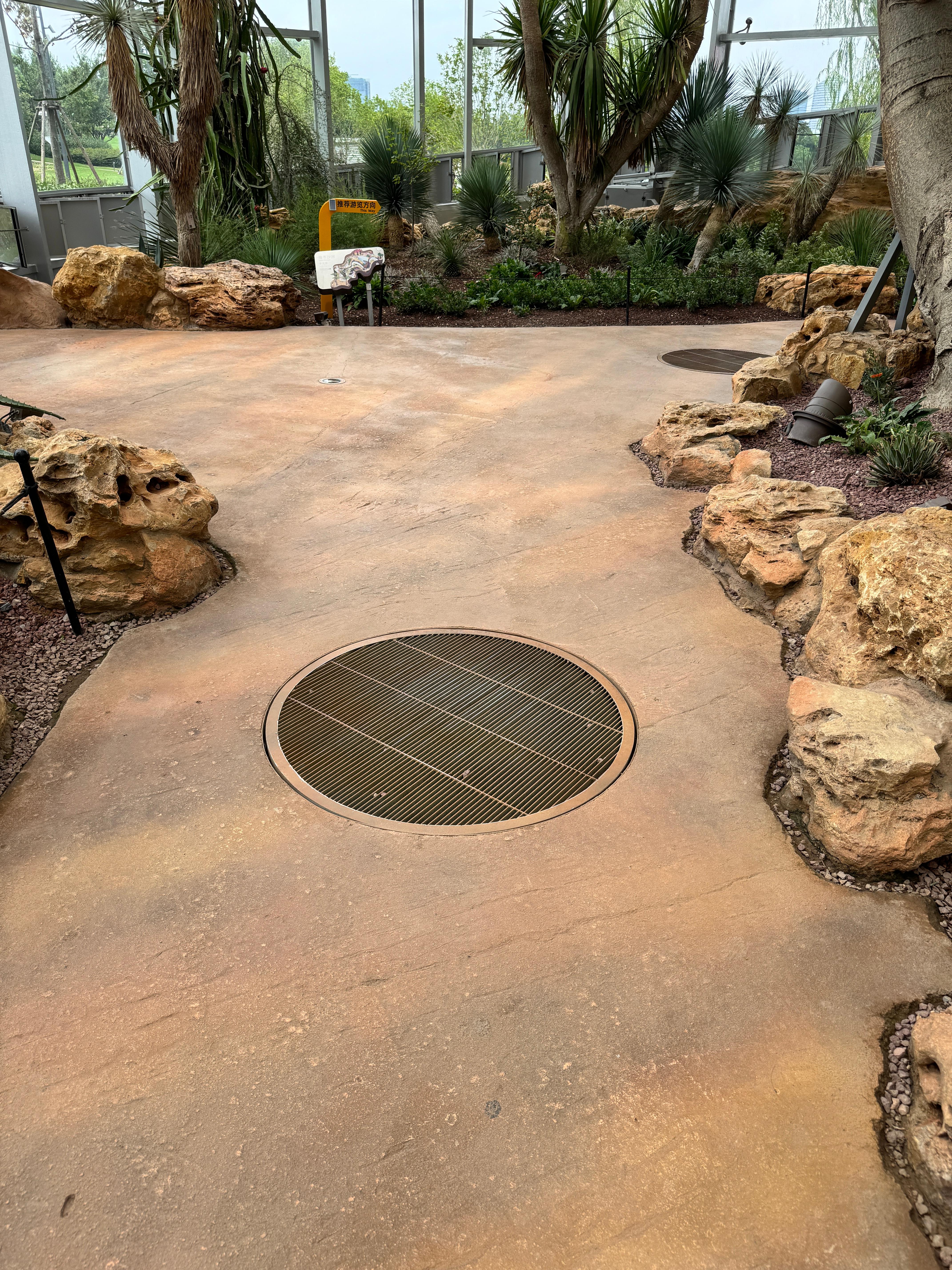 바닥 곳곳에 이렇게 에어컨홀(Hole) 많이 있다. 여기를 통해서 시원한 냉기가 공급이 되고 식물들에게는 큰 영향이 없이 관람객에게만 냉기가 전달된다.