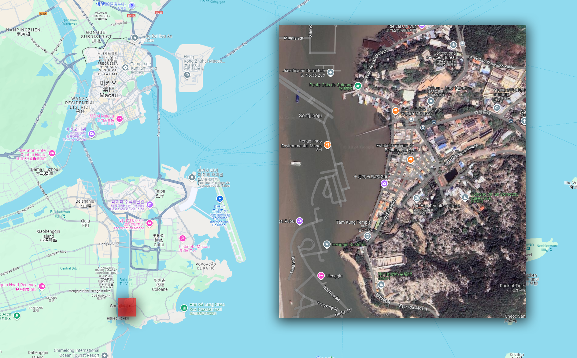 그런데 이 섬중에서도 좀 큰게 타이파(Taipa)섬과 콜로안(Coloane)섬이 있다. 그리고 이 두 섬사이의 거리가 길지 않아서 이 사이를 간척사업으로 메꿔서 육지로 만들었다. 이 지역이 현재의 코타이(Cotai) 스트립(Strip)이다.