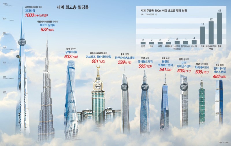 그림에서 1위로 있는 제다타워는 아직도 완공이 안되었으므로 현재 세계 최고층 빌딩은 두바이 부르즈 칼리파이다.