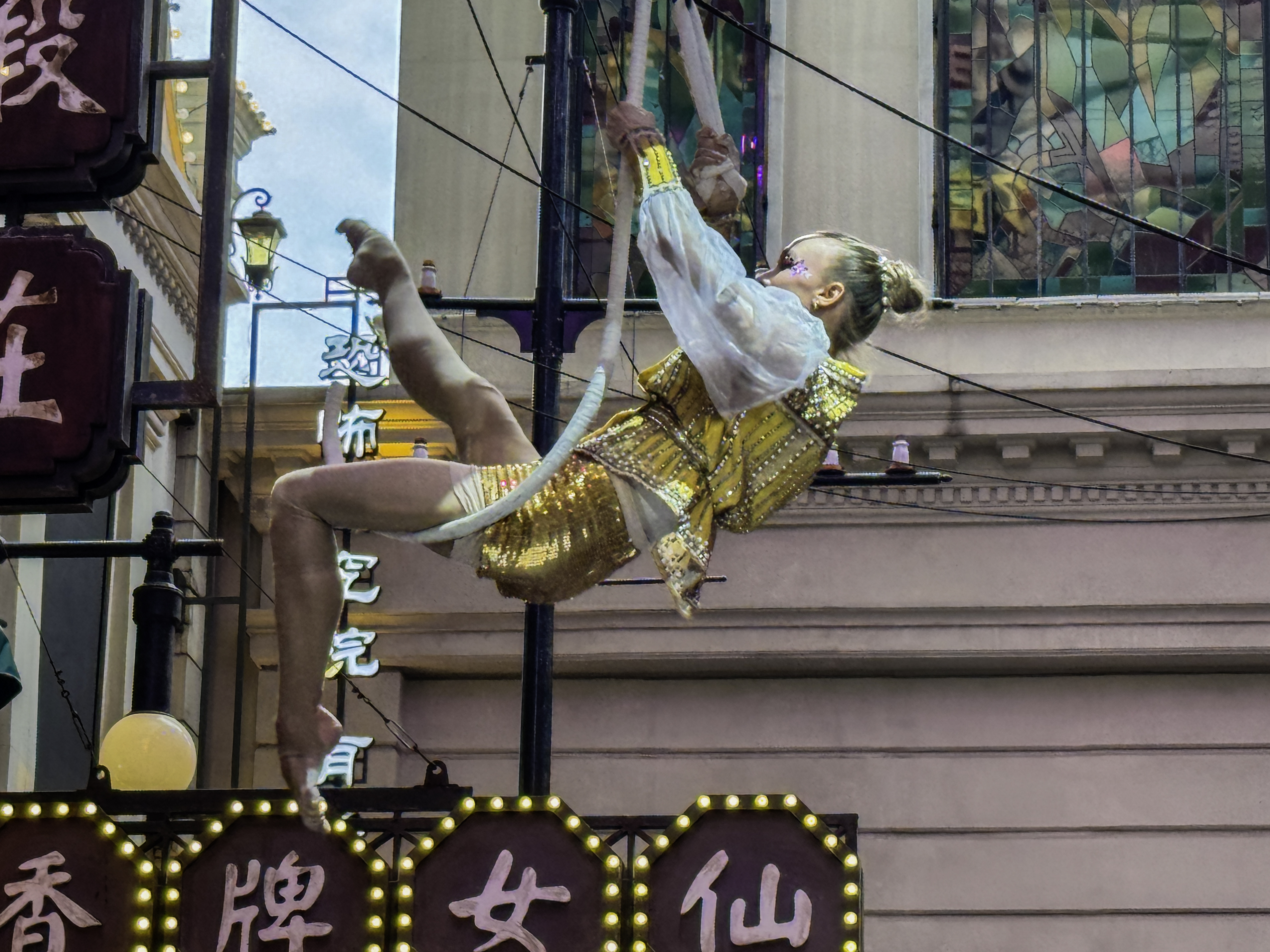 공중에 매달려서 폴댄스를 보여주는 배우는 딱봐도 중국배우는 아니고 전문적으로 서커스 훈련을 받은 배우 같다.